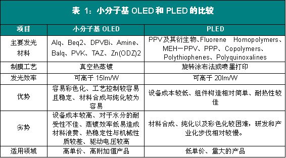 一是以有机染料和颜料等为发光材料的小分子基OLED,典型的小分子发光材料为Alq(8-羟基喹啉铝);另一种是以共轭高分子为发光材料的高分子基OLED,简称为PLED,典型的高分子发光材料为PPV(聚苯撑乙烯及其衍生物[5]。